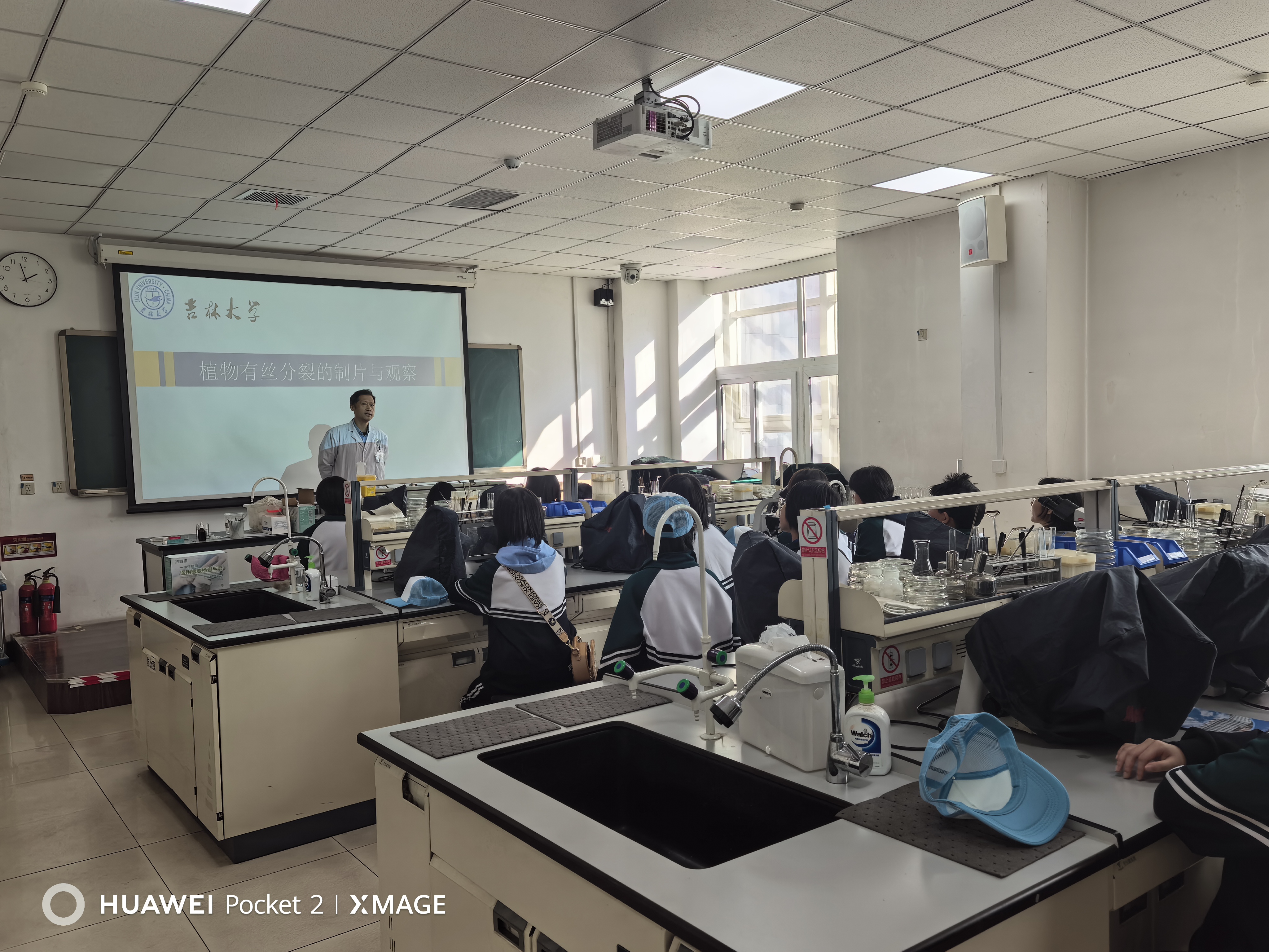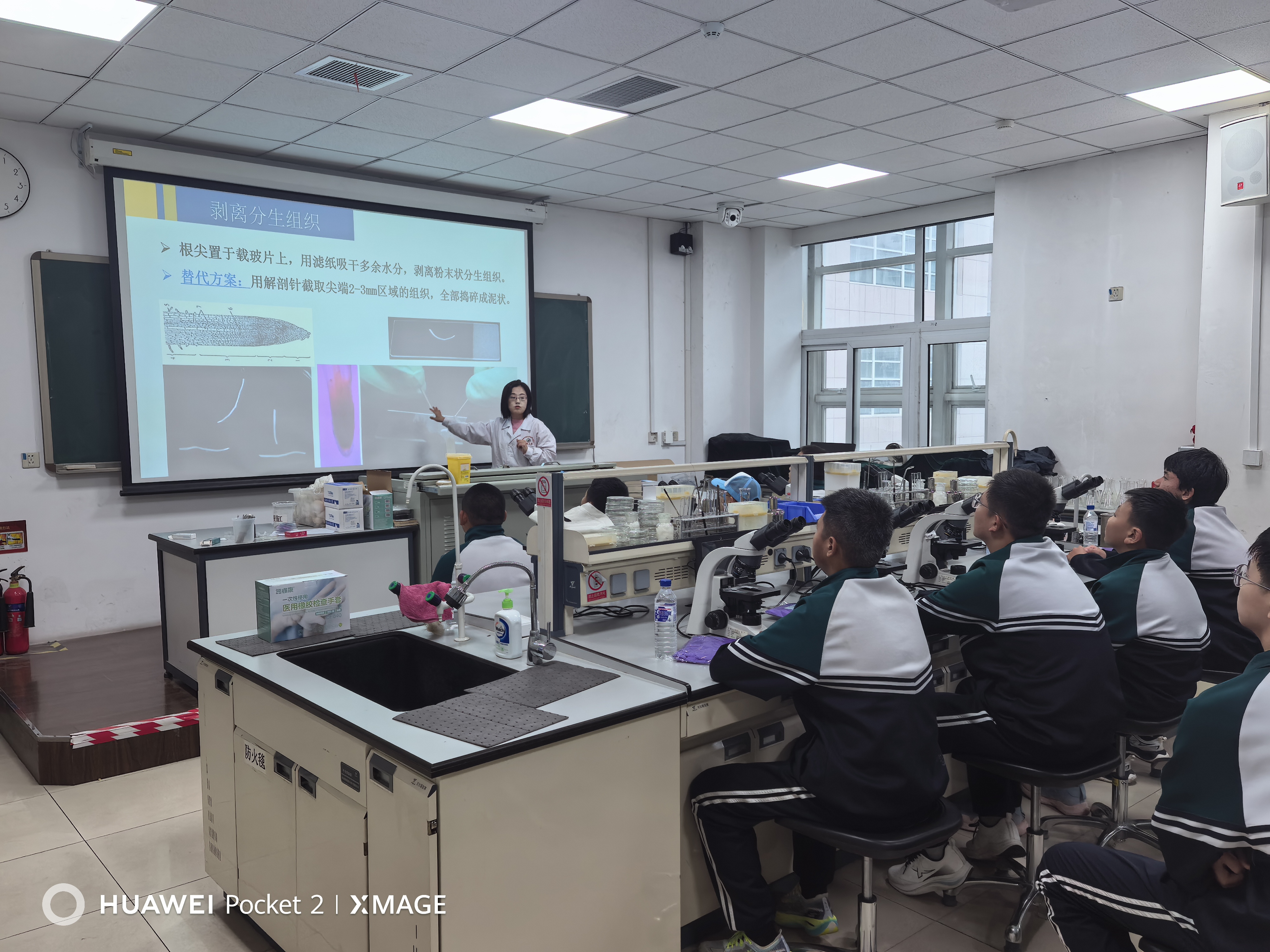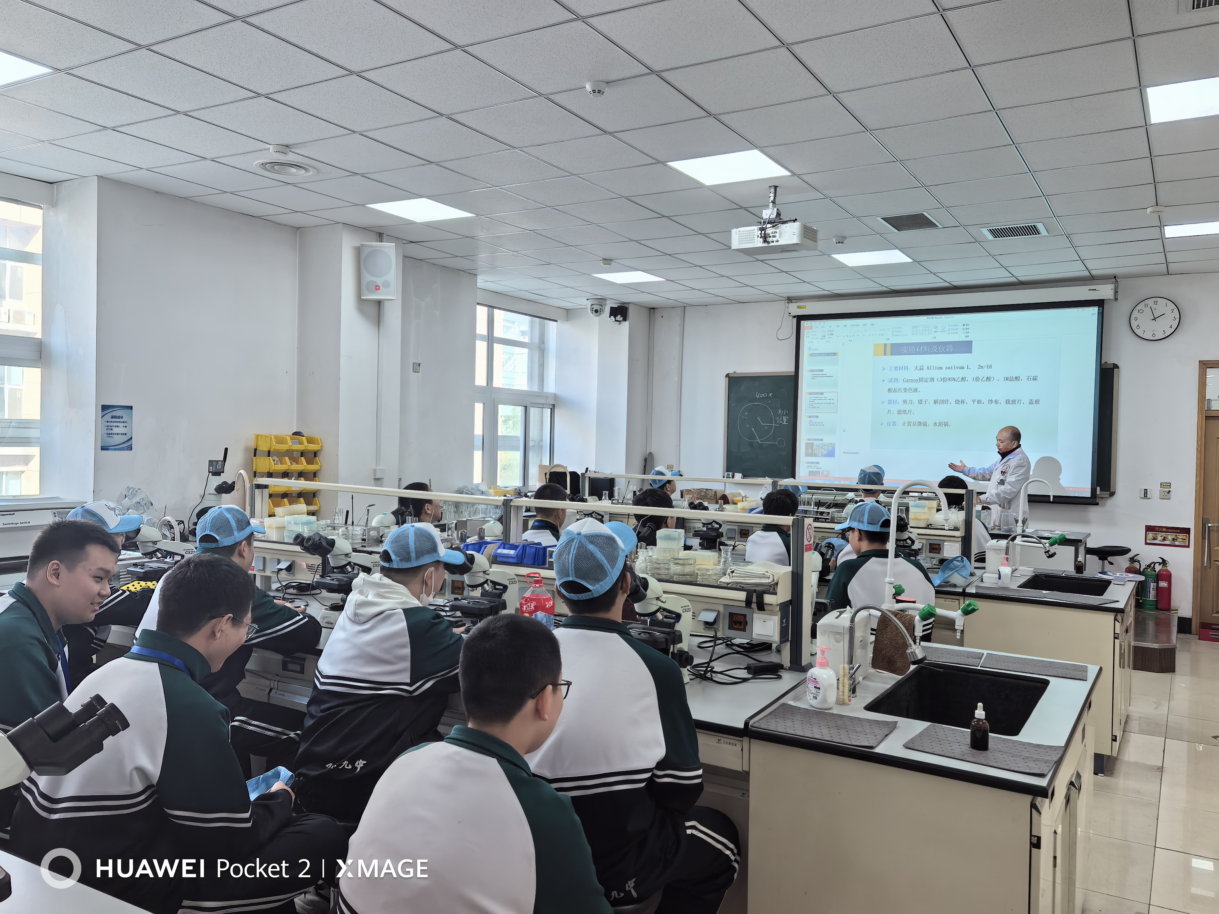 期间,中心高波、孟令军、姜丹、李臣亮等4 位教师全程组织参观了中心的实验室和指导了“细胞有丝分裂实验”。同学们通过教师趣味化的细胞分裂原理讲解和现场示范的制片过程与显微观察操作技巧,即学习了实验理论知识,又掌握了实践操作中的重点难点。在同学们实验操作过程中,教师针对学生在取材、染色、压片等过程中遇到的问题,逐一耐心指导,确保每位学生都能独立完成实验操作,并成功观察到细胞分裂间期、前期、中期、后期、末期的典型形态特征,收获满满的科学体验感。